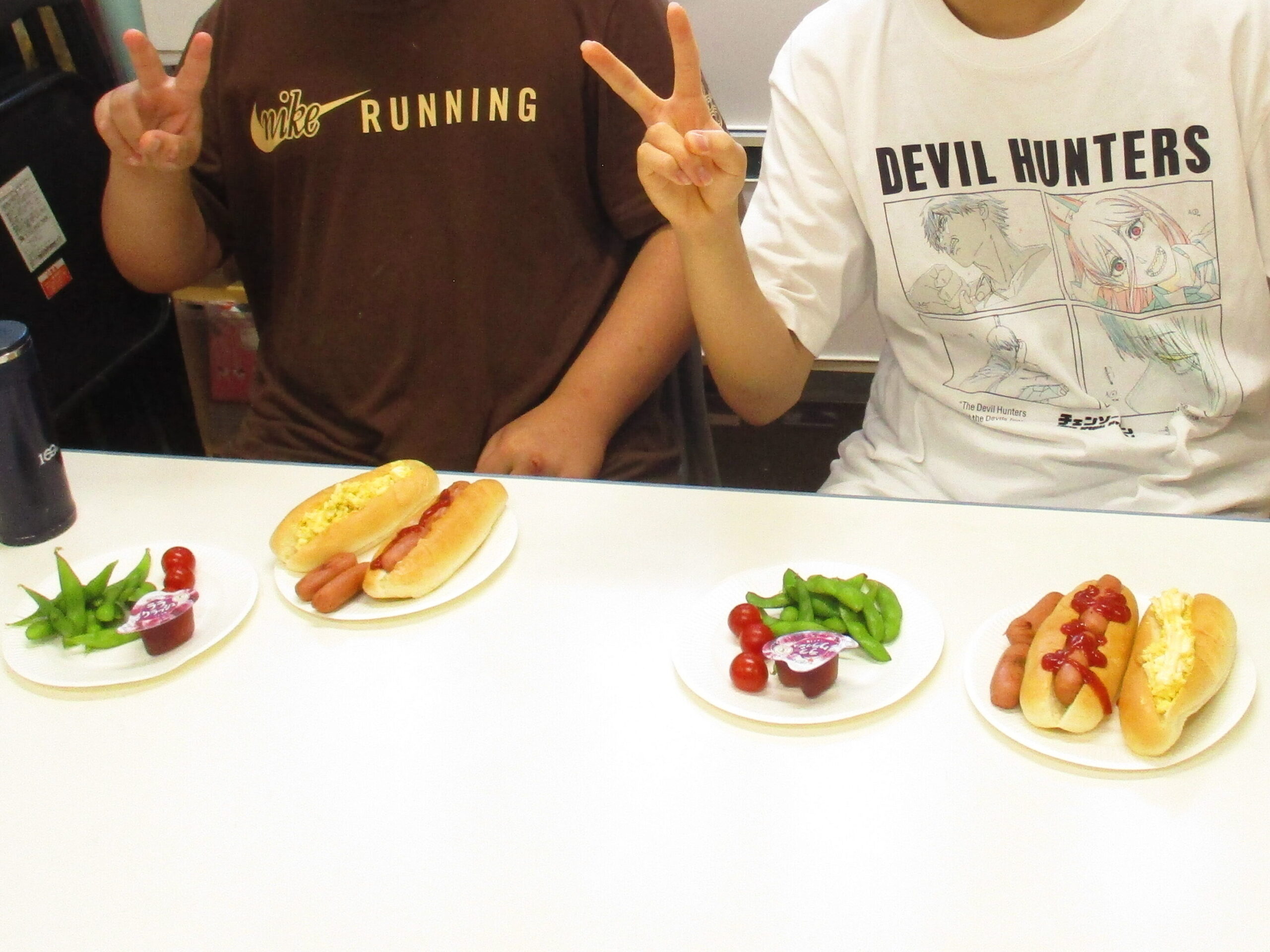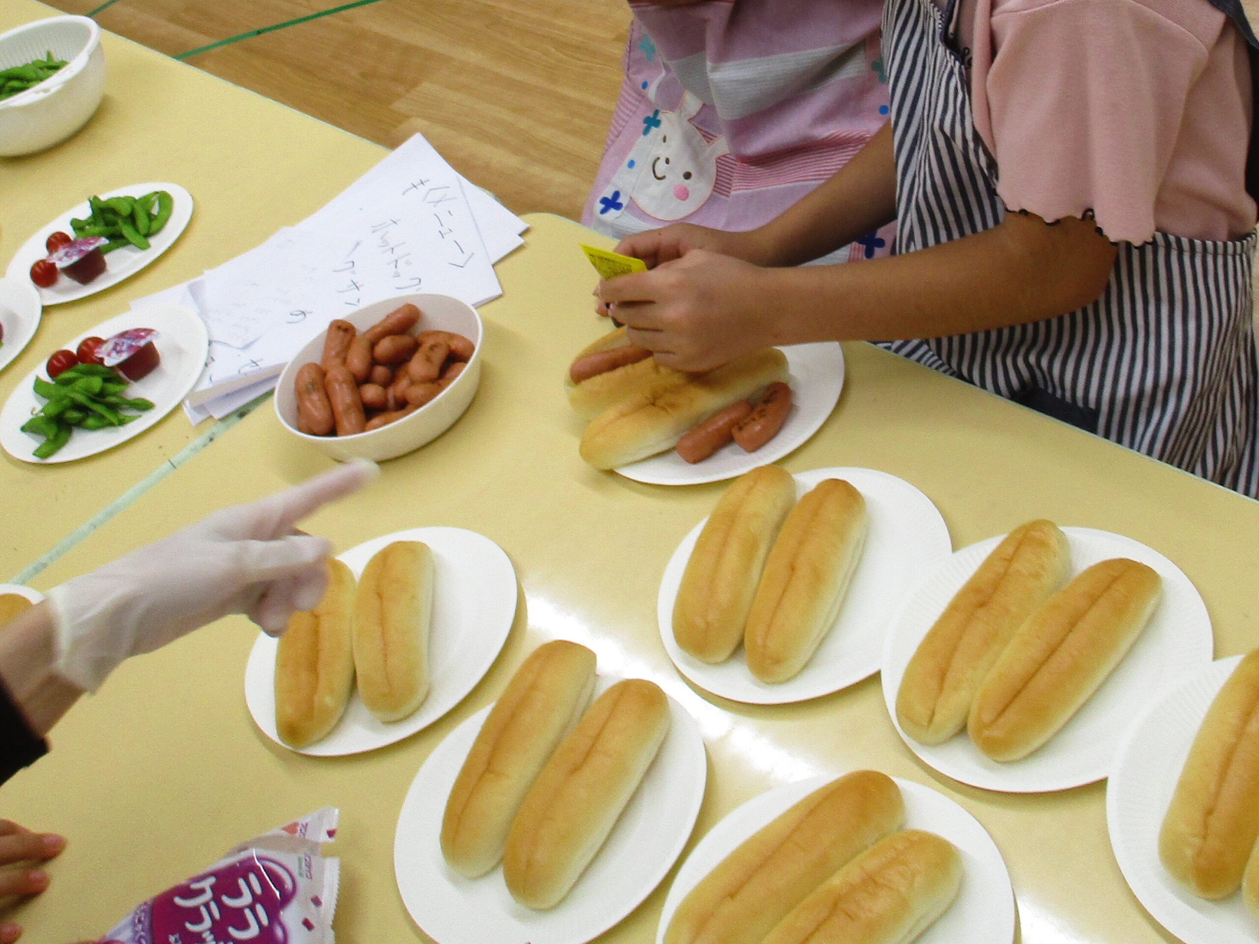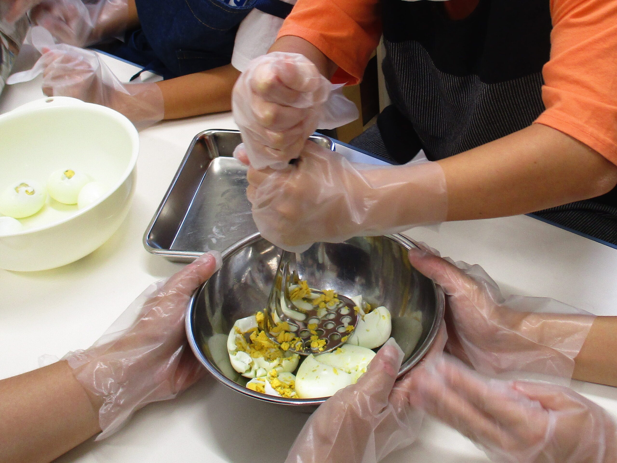 ウインナーを焼いたり、ゆで卵の殻をむいてつぶしたりと楽しみながら調理をしました。
