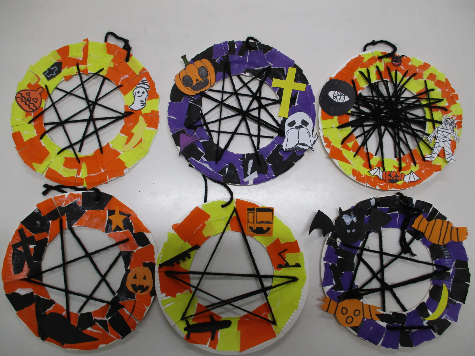 蜘蛛の巣をモチーフとし、紙皿に好きな色の折り紙でちぎり絵をし、ハロウィンにちなんだ飾りをそれぞれ作り、個性豊かな作品に仕上がりました☆